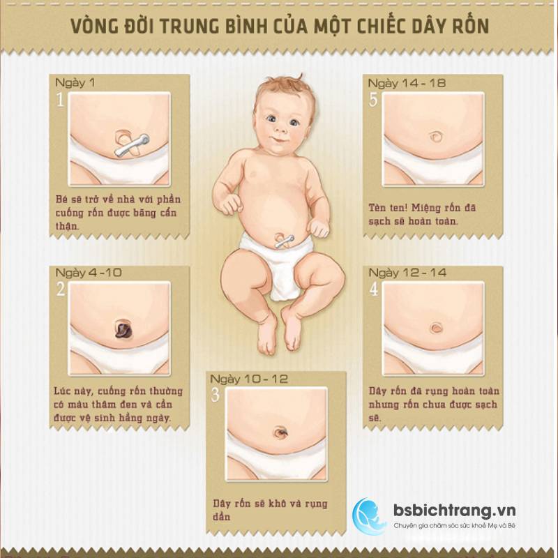 Việc chăm sóc đúng giúp cuống rốn khô lại, chuyển màu nâu sẫm, tự rụng sau 7–14 ngày (có thể tới 3 tuần) mà không để lại sẹo lồi hay u hạt rốn.