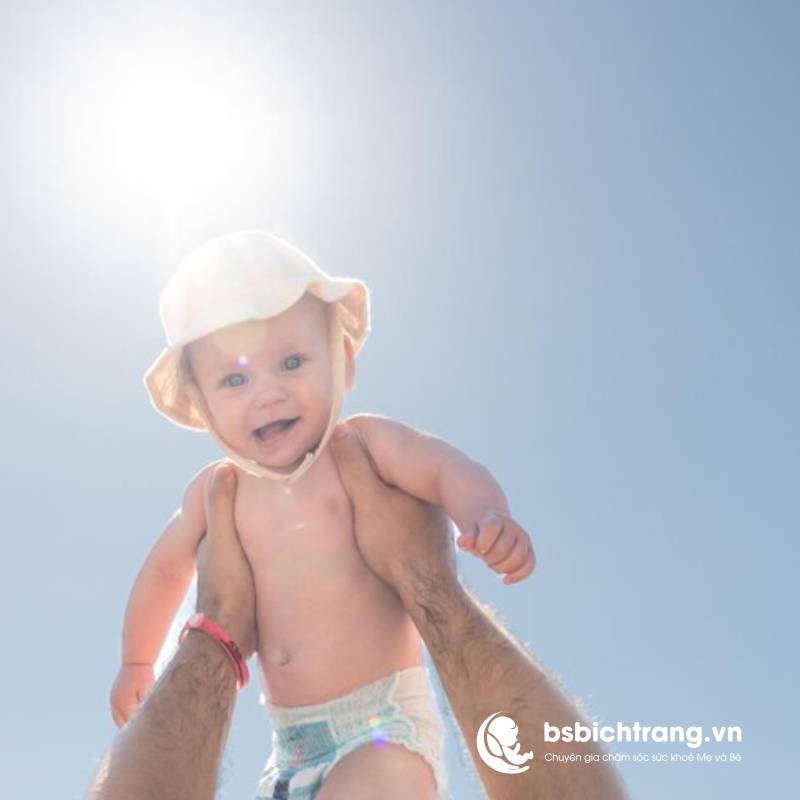 - Chỉ số UV: Dưới 3 (khung giờ trước 9 h và sau 16 h). Trẻ dưới 6 tháng chưa dùng kem chống nắng; vì thế sử dụng mũ rộng vành, áo dài tay chất liệu cotton, tấm phủ xe đẩy chống tia UV.